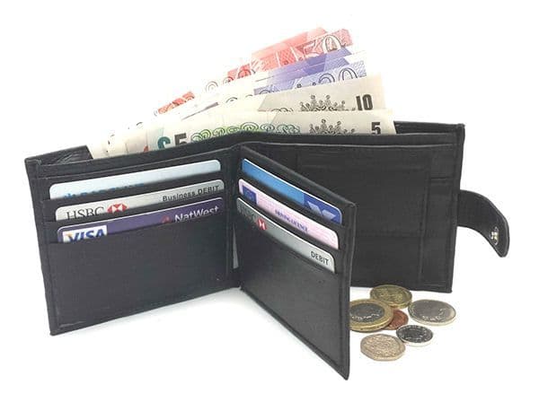 Gents 100% Genuine Leather Bi-Fold Wallet with classic silver & gold Theatre Mask motif making a great music gift for musician or actor.