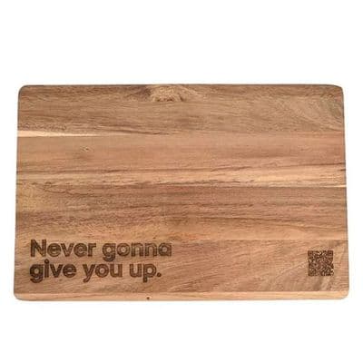 “Never Gonna To Give You Up” rectangular cheese board an attractive item made in acacia wood with attractive wording.