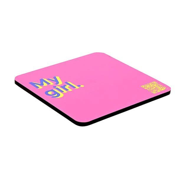 The Temptations “My Girl” 95mm coaster in pink with cork backing with QR code where you download your song.