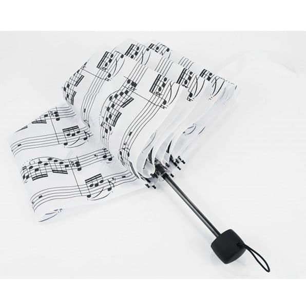 Sheet music umbrella in white with slip over cover with black music manuscript making a great music gift for any musician, music teacher or music student.